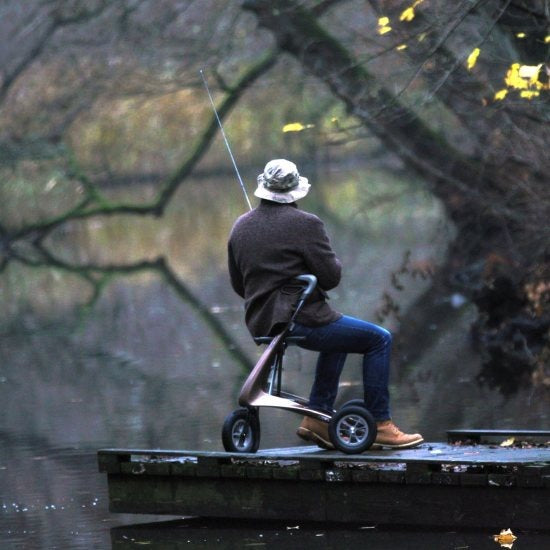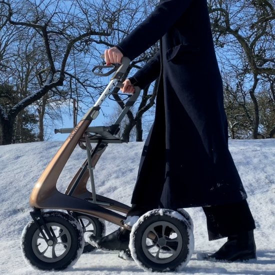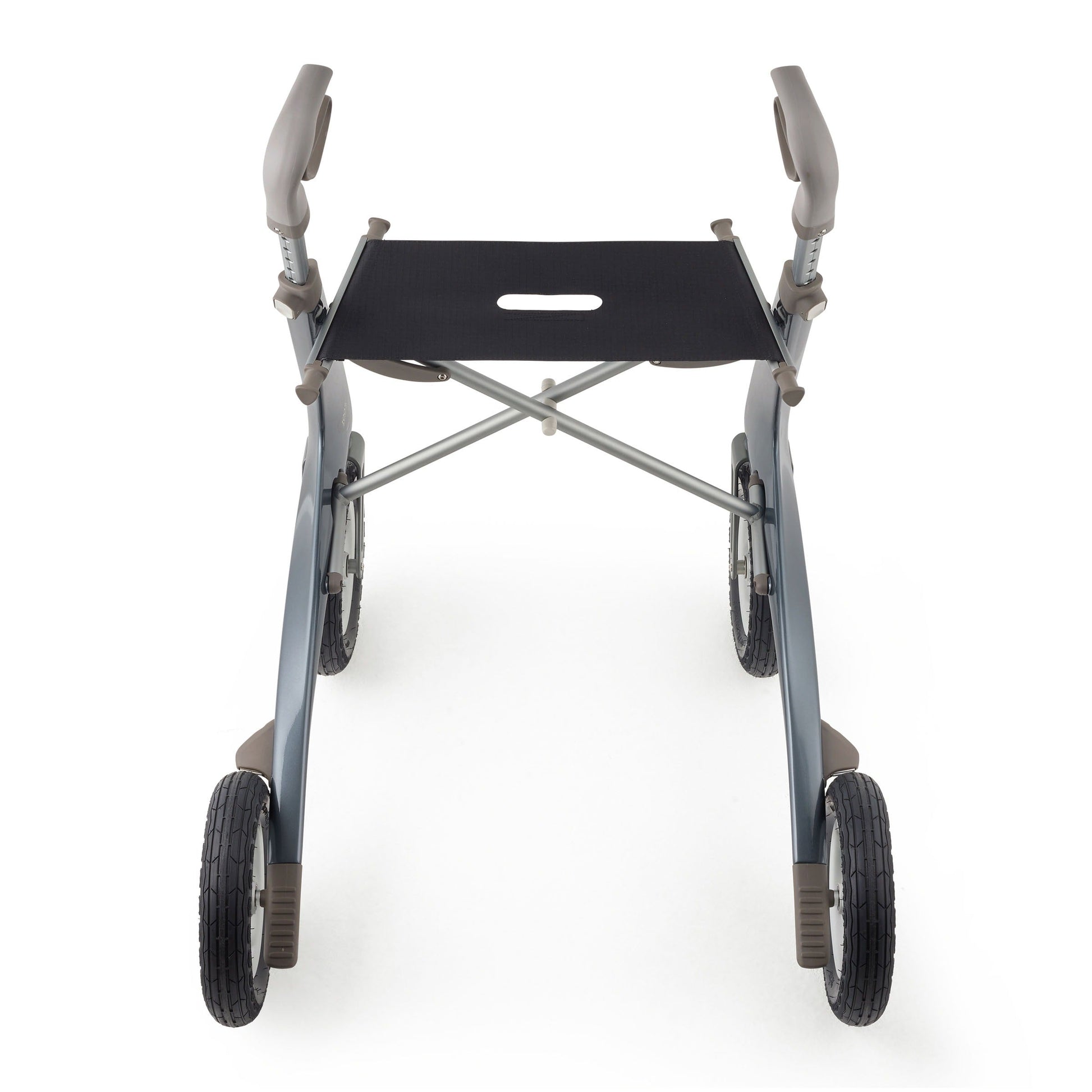 - All-terrain rollator with ultra-durable pneumatic tires and superb suspension
